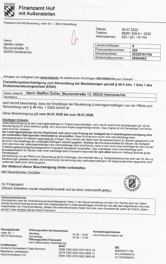 Freistellungsbescheinigung zum Steuerabzug bei Bauleistungen gemäß § 48 b. Abs.1 Satz 1 des Einkommensteuergesetzes (EStG)